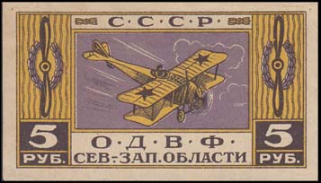 В центре самолет-моноплан над городом. Сверху аббревиатура «С.С.С.Р.». Внизу номинал и текст в две строки: «О.Д.В.Ф. Сев[еро]-Зап[адной]. области».