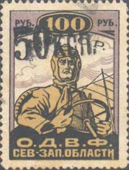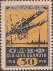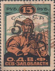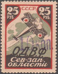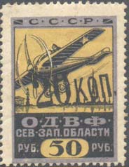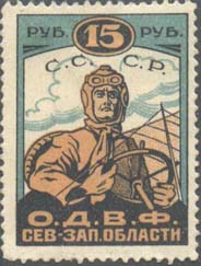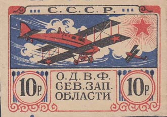 Разм. рамки 55 х 30 мм. В центре самолет-биплан, снижающийся слева направо. По бокам пропеллеры в обрамлении венков. Сверху аббревиатура «С.С.С.Р.». Внизу текст в две строки: «О.Д.В.Ф. Сев[еро].-Зап[адной]. области». В нижних углах в прямоугольных рамках номинал.