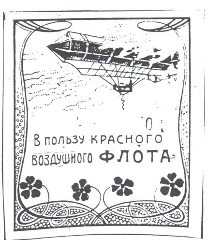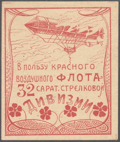 1923 г. 01.05.1923 г. Разм. рамки 62 х 75 мм. В прямоугольной рамке с растительным орнаментом сверху дирижабль, летящий влево в облаках. Внизу текст в четыре строки: «В пользу Красного Воздушного Флота 32 Сарат[овской]. стрелковой дивизии».