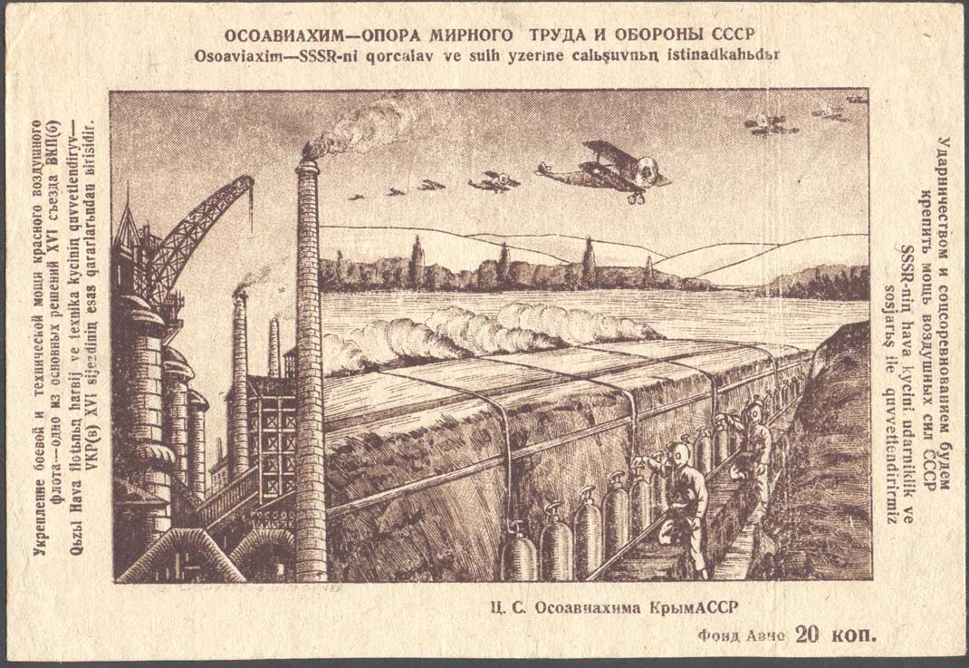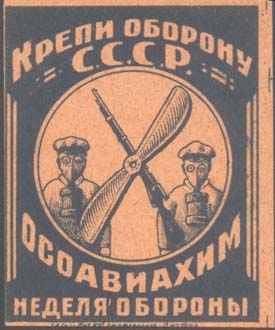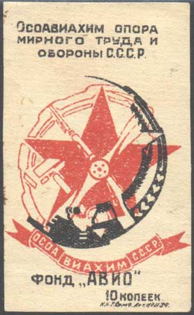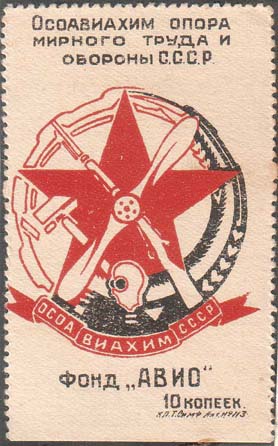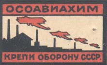 1927 г. Разм. рамки 36 х 22 мм. Двухцветная печать на бумаге различных цветов и качества. В центре в прямоугольной рамке заводские здания и четыре летящих самолета. Сверху аббревиатура «ОСОАВИАХИМ». Внизу текст: «Крепи оборону СССР».