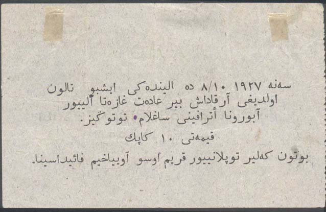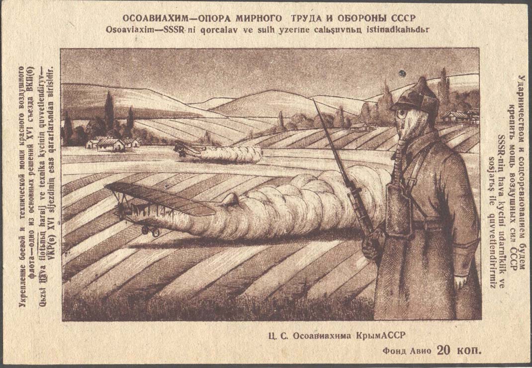 1927 г. Листок из квитанционной книжки разм. 105 х 67 мм. Одноцветная двухсторонняя печать на тонкой серо-зеленой бумаге. Левосторонняя зубц. 11 1/2. На лицевой стороне текст в семь строк: «Все на оборону страны! ТАЛОН. Предъявитель сего 7-го ноября 1927 г. Получает экземпляр газеты «Крепите оборону страны». Цена 10 коп. Весь доход поступает в пользу Крым[ского]. ОСО-АВИАХИМА. Внизу под тонкой горизонтальной чертой выходные данные мелким шрифтом: «Крымлит 3752. Тип. Рекорд. Тираж 100,000». Слева вертикальная черта. Левее текст в две строки вертикально снизу вверх: «Талон без печати ОСО-Авиахима не действительный». На лицевой стороне фиолетовый оттиск круглой контрольной печати диаметром 44 мм с неразборчивым текстом. На оборотной стороне текст в пять строк на татарском языке арабским шрифтом.