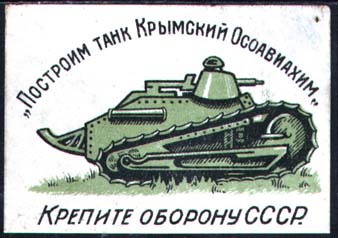 1930(?) г. Разм. 55 х 40 мм. Двухцветная печать на плотной белой бумаге. В центре изображение танка. Сверху полукругом текст: «Построим танк Крымский ОСОАВИАХИМ». Снизу текст: «Крепите оборону СССР». Справа внизу мелким шрифтом выходные данные.