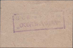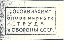 1930(?) г. Разм. 60 х 40 мм. Одноцветная печать фиолетовыми чернилами ручным каучуковым штампом на бумаге различных цветов. В центре в прямоугольной рамке разм. 36,5 х 12 мм текст в две строки: «Все в ряды «ОСОАВИАХИМА»».