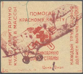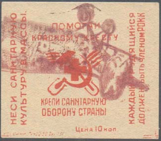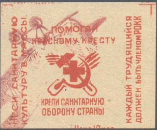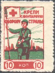 1932 г. Разм. рамки 21 х 29 мм. Двухцветная печать на белой бумаге. Нерегулярная зубц. В центре в прямоугольной рамке санитарка с флагом с красным крестом на фоне городского пейзажа. Сверху текст в три строки: «Крепи санитарную оборону страны». Внизу номинал в круглых рамках.