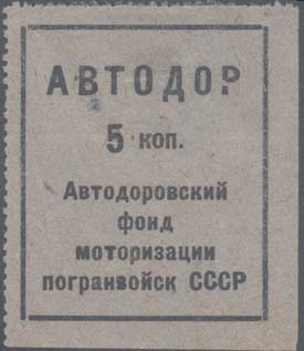 1931 г. Разм. рамки 37,5 х 45 мм. Одноцветная печать на бумаге различных цветов. Зубц. 11 1/2. В прямоугольной рамке в центре номинал. Сверху текст «Автодор». Внизу текст в четыре строки: «Автодоровский фонд моторизации погранвойск СССР».