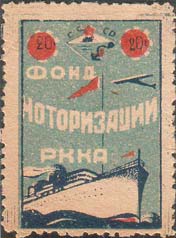 0 г. 1933 Разм. рамки 23 х 35 мм. Трехцветная печать на желтой бумаге. В центре текст в три строки: «Фонд моторизации Р.К.К.А.». Сверху эмблема ОСВОД и силуэт самолета. Сверху по углам в круглых рамках с зубчатыми краями номинал. Внизу пароход в движении.