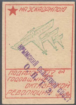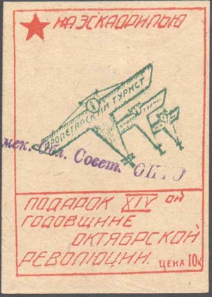 1931 г. Разм. рамки 48 х 66 мм. Двухцветная печать на толстой кремовой бумаге. В рамке три самолета-моноплана, на крыльях которых текст: «Пролетарский турист». Сверху пятиконечная звезда и текст: «На эскадрилью». Внизу продолжение текста в четыре строки: «Подарок ХIV-ой годовщине Октябрьской революции». В правом нижнем углу номинал: «Цена 10 к.».