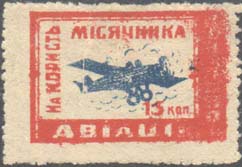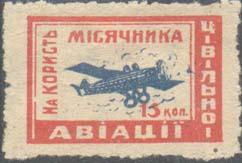 1931 г. Разм. рамки 33 х 22 мм. Двухцветная печать на белой бумаге. Зубц.11 1/2. В центре самолет-моноплан, летящий вправо. По периметру текст на украинском языке: «В пользу месячника гражданской авиации».