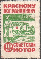 1932 г. Разм. по перфорации 27 х 40 мм. Двухцветная печать на белой бумаге. Нерегулярная зубц. Красноармеец с винтовкой на фоне автомобиля с солдатами. Сверху текст в две строки: «Красному пограничнику». Внизу номинал в круглой рамке и продолжение текста в две строки: «Советский мотор».
