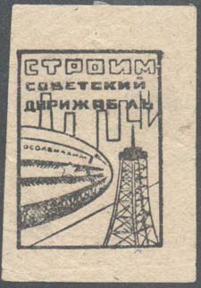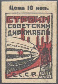 1930(?) г. Разм. рамки 27 х 38 мм. Двухцветная печать на бумаге различных цветов. В прямоугольной рамке дирижабль «ОСОАВИАХИМ» у причальной мачты на фоне заводских зданий. Сверху текст в три строки: «Строим советский дирижабль». Внизу аббревиатура «СССР». Сверху над рамкой номинал: «Цена 10 коп.».