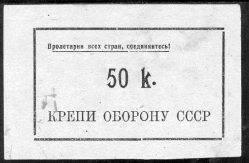 1932 г. Разм. 79 х 51 мм. Одноцветная печать на белой бумаге. В прямоугольной рамке разм. 64 х 37 мм в центре номинал. Сверху текст мелким шрифтом: «Пролетарии всех стран, соединяйтесь!». Внизу текст: «Крепи оборону СССР».