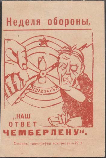 1927 г. Разм. 60 х 87 мм. Одноцветная печать на желтоватой бумаге. В прямоугольной рамке разм. 50 х 54 мм аллегорический рисунок: на фоне значка Осоавиахима рука и голова Чемберлена, зажатая между винтовкой и пропеллером эмблемы. Сверху над рамкой текст: «Неделя обороны». Внизу под рамкой текст: ««Наш ответ Чемберлену»». Внизу под чертой выходные данные мелким шрифтом: «Тюмень, типография комтреста-27 г.».