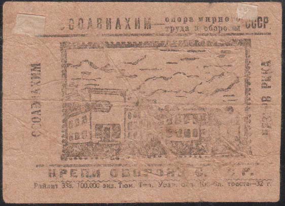 1932 г. Разм. 93 х 66 мм. Одноцветная двухсторонняя печать на тонкой коричнево-оранжевой бумаге. На лицевой стороне в прямоугольной декоративной рамке здание Дома Обороны. По наружному периметру рамки текст: «ОСОАВИАХИМ – опора мирного труда и обороны СССР. ОСОАВИАХИМ резерв РККА. Крепи оборону С.С.С.Р.». Внизу под волнистой чертой мелким шрифтом выходные данные неразборчиво. На оборотной стороне в прямоугольной декоративной рамке разм. 55 х 36 мм текст в две строки: «3 кирпича на дом Обороны». Ниже номинал: «30 к.».