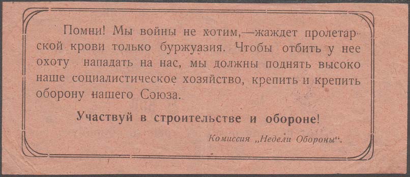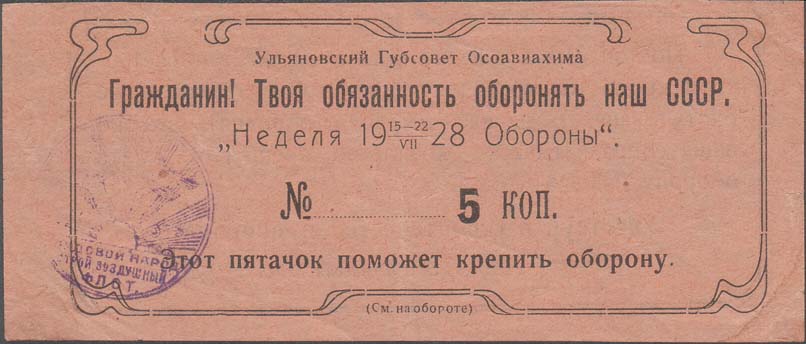 1928 г. 15.-22.07.1928 г. Листок разм. 130 х 58 мм. Одноцветная двухсторонняя печать на желтовато-серой бумаге. На лицевой стороне в декоративной рамке текст в пять строк: «Ульяновский Губсовет Осоавиахима. Гражданин! Твоя обязанности оборонять наш СССР. «Неделя 15.-22./VII 1928 обороны». № ... 5 коп. Этот пятачок поможет крепить оборону». Внизу под рамкой мелким шрифтом текст: «(См. на обороте)». В левом нижнем углу фиолетовый оттиск круглой печати ОДВФ(?). На оборотной стороне в декоративной рамке текст в семь строк: «Помни! Мы войны не хотим – жаждет пролетарской крови только буржуазия. Чтобы отбить у нее охоту нападать на нас, мы должны поднять высоко наше социалистическое хозяйство, крепить и крепить оборону нашего Союза. Участвуй в строительстве и обороне! Комиссия «Недели обороны»».