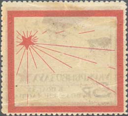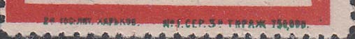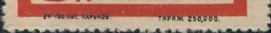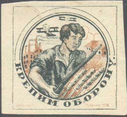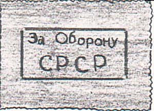 1930(?) г. Разм. рамки 37 х 17,5 мм. Одноцветная печать на лиловой бумаге. Нерегулярная зубц. В прямоугольной рамке текст в две строки на украинском языке: «За оборону СССР».