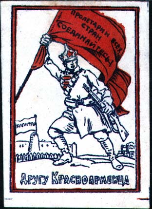 1924(?) г. Разм. рамки 45 х 65 мм. Двухцветная печать на белой бумаге. В центре красноармеец со знаменем в правой руке и винтовкой в левой. На знамени текст в три строки: «Пролетарии всех стран, соединяйтесь!». На заднем плане изображение крепости. На одной из башен крепости флаг с текстом: «Капитал». Внизу текст: «Другу Красноармейца».