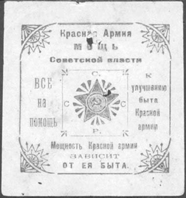1925 г. Разм. 54 х 54 мм. Одноцветная печать на тонкой желтоватой бумаге низкого качества. В прямоугольной декоративной рамке в цитре дополнительная прямоугольная рамка, в которой красная звезда с серпом и молотом и буквы аббревиатуры: «.С.C.С.Р.». По периметру между рамками текст: «Красная Армия мощь Советской власти. Мощь Красной армии зависит от ее быта. Все на помощь к улучшению быта Красной армии».