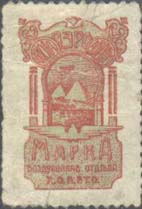 1910(?) г. Разм. по перфорации ≈ 24 х 34 мм. Двухцветная печать на белой бумаге. Зубц. 11 1/4. С клеем. В центре в декоративной рамке летящий самолет на фоне пирамид и реки. Текст: «А.Э.Р.О. Школа авиации. Марка воздухоплав[ательного]. Отдела Х.О.И.Р.Т.О.».