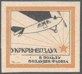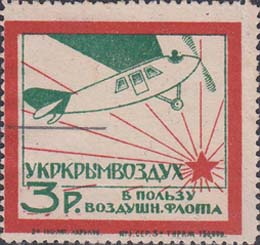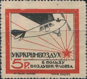 1923 г. Первый республиканский выпуск. Разм. рамки 40 х 35 мм. Двухцветная печать на белой бумаге. Зубц. 11 1/2. С клеем. В двойной прямоугольной рамке в центре самолет-моноплан, летящий вправо. В правом нижнем углу пятиконечная звезда с лучами. Внизу в центре текст в три строки: «Укркрымвоздух в пользу Воздушн[ого]. Флота». Внизу под рамкой выходные данные мелким шрифтом.