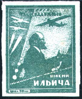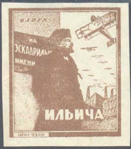 1924 г. Разм. рамки 38 х 45 мм. Одноцветная печать на белой бумаге. Зубц. 11 1/2. И Б.З. В рамке различные рисунки. Текст: «ОАВУК на эскадрилью имени Ильича». В левом нижнем углу номинал.