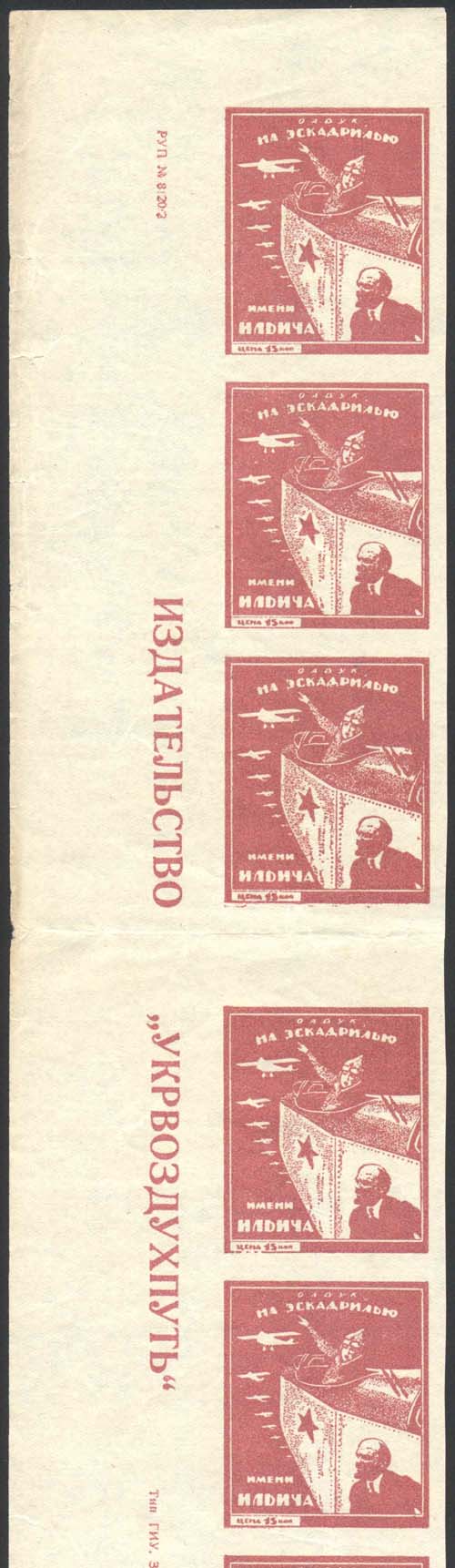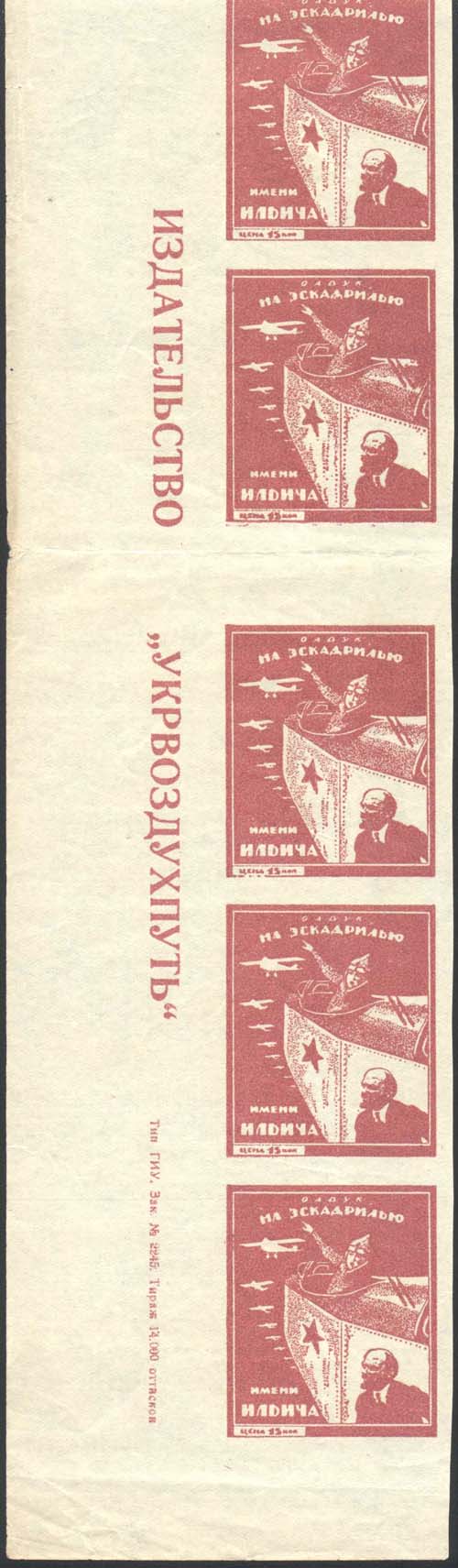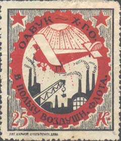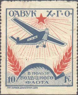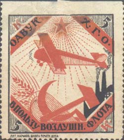 1924 г. Двухцветная печать на белой бумаге. Зубц. 11 1/2. В прямоугольной рамке различные рисунки. Текст «ОАВУК Х.Г.О. В пользу воздушного флота». Под рамкой выходные данные: «Лит. Харьков. Школа печатного дела».