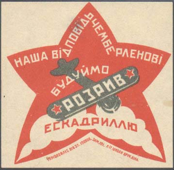 1927(?) г. Разм. 59 х 58 мм. Двухцветная печать на белой бумаге. На фоне пятиконечной звезды самолет и текст в четыре строки на украинском языке: «Наш ответ Чемберлену. Строим эскадрилью «Раз-рыв»». Внизу мелким шрифтом выходные данные: «Укрглавлит 01637 150000 зак. 101. Лит. школа печатн. дела»