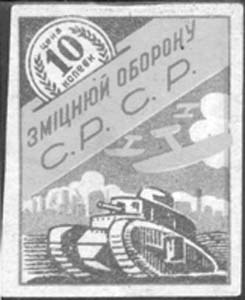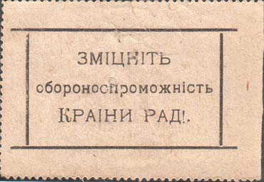 1930(?) г. Разм. 46,5 х 28 мм. Одноцветная печать на желтоватой бумаге. Зубц. 11 1/2. В прямоугольной рамке текст в три строки на украинском языке: «Укрепить обороноспособность страны Советов!»