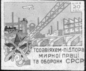 Разм. рамки 45 х 26 мм. Самолет над заводом и гидроэлектростанцией, слева внизу подъемный кран и эмблема ОСОАВИАХИМ. Справа внизу текст в три строки на украинском языке: «Осоавиахим - опора мирного труда и обороны С.С.С.Р.». В правом верхнем углу номинал.