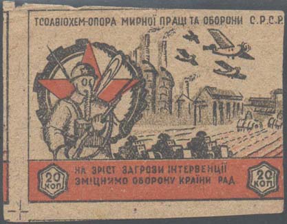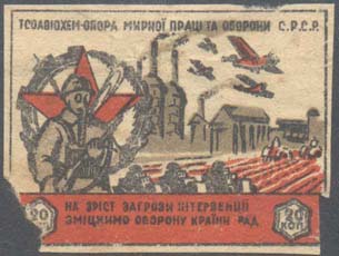 1927(?) г. Разм. рамки 44 х 34 мм. Трехцветная печать на сероватой бумаге. В прямоугольной рамке красноармеец в противогазе, эмблема ОСОАВИАХИМ и три танка на фоне аграрно-индустриального пейзажа. Сверху четыре самолета. Сверху текст на украинском языке: «Осоавиахим - опора мирного труда и обороны СССР». Внизу текст на украинском языке в две строки: «В ответ на угрозу интервенции укрепляйте оборону Страны Советов». В нижних углах номинал в шестиугольных рамках.