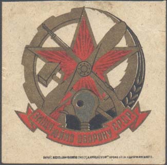 1929 г. 21.09.1929 г. Разм. 55 х 55 мм. Трехцветная печать на желто-ватой бумаге. В центре эмблема ОСОАВИАХИМ. На ленте текст на украинском языке: «Крепи оборону СССР». Внизу мелким шрифтом выходные данные на украинском языке: «Окрлит 03212з. 634 1000000. трест Харполиграф Хромлит. Им. Дзержинского». Сбор в День обороны.