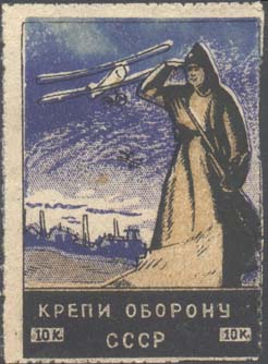 1930 г. Разм. рамки 31,5 х 52 мм. Нерегулярная зубц. Трехцветная печать на желтоватой бумаге. В прямоугольной рамке в центре справа пограничник с винтовкой, слева городской пейзаж. В левом верхнем углу в небе самолет-биплан. Внизу текст в две строки: «Крепи оборону СССР. 10 копеек».