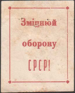 Разм. рамки 35 х 45 мм. В центре по диагонали текст на украинском языке в две строки: «Укрепляй оборону С.С.С.Р.». В левом верхнем углу 10-копеечная монета. Внизу танк и самолеты над городом.