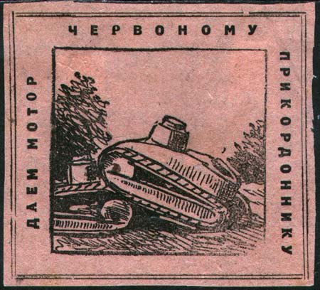 1930(?) г. Разм. рамки 70 х 63 мм. Одноцветная печать на тонкой розово-серой бумаге. В центре в прямоугольной рамке два танка. По периметру рамки текст на украинском языке: «Даем мотор красному пограничнику».