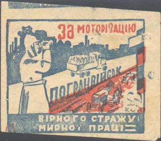 1930(?) г. Разм. рамки 46 х 38 мм. Двухцветная печать на белой бумаге. В центре на дороге автомобиль с красноармейцами в кузове. На заднем плане город. На переднем плане пограничник с биноклем и трактора в поле. Справа пограничный столб. В правом нижнем углу номинал. Текст на украинском языке в четыре строки: «За моторизацию погранвойск, верного стража мирного труда».