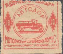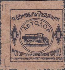 1932 г. Разм. рамки 29 х 28 мм. Одноцветная печать на розово-серой бумаге. Нерегулярная зубц. В центре в двойной круглой рамке диаметром 19 мм грузовой автомобиль и аббревиатура «АВТОДОР». Слева и справа в ромбовидных рамках номинал. Сверху полукругом текст на украинском языке: «Автомобиль - трудящимся». Внизу текст в две строки на украинском языке: «Моторизуя Красную Армию – укрепляешь обороноспособность СССР».