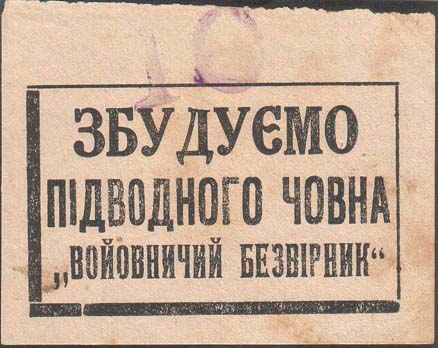 1930(?) г. Разм. рамки 64 х 39 мм. Одноцветная печать желтоватой бумаге. В прямоугольной рамке текст на украинском языке в три строки: «Построим подводную лодку «Воинствующий Безбожник»». На лицевой стороне крупная фиолетовая надпечатка номинала в виде цифры «10».