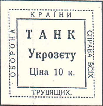 1932(?) г. Одноцветная печать желтоватой бумаге. В двойной прямоугольной рамке в центре текст на украинском языке в две строки: «Танк УКРОЗЕТа». Ниже номинал: «Цена 10 к.». По периметру между рамками текст: «Оборона страны – дело всех трудящихся».