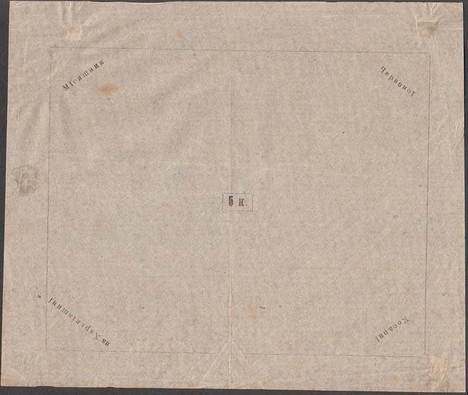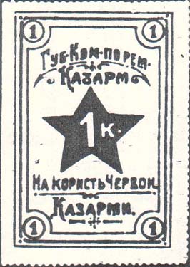 1925 г. Разм. рамки 38 х 57 мм. Одноцветная печать на белой бумаге. Зубц. 11 1/2. В тройной прямо-угольной рамке в центре пятиконечная звезда с номиналом. Сверху текст в две строки: «Губ[ернский]. Ком[итет]. по рем[онту]. Казарм». Внизу текст в две строки на украинском языке: «В пользу Красн[ой]. Казармы». По углам в круглых рамках номинал.