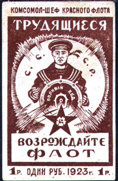 1923 г. Разм. рис. 35 х 50 мм. Одноцветная печать на белой (оттенки) бумаге. В центре в круглой рамке матрос, стоящий за штурвалом. На штурвале текст полукругом: «Полный ход». Выше полукругом аббревиатура «С.С.С.Р». Внизу звезда с серпом и молотом в центре. Текст в три строки: «Трудящиеся возрождайте флот». Сверху над рисунком текст: «Комсомол – шеф красного флота». Внизу под рисунком номинал.