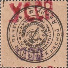 1923 г. Разм. по перфорации 37 х 37 мм. Одноцветная печать на желтоватой бумаге. Зубц 12. С клеем. В центре в тройной круглой рамке стилизованный герб Р.С.ф.С.Р. По окружности между рамками текст: «Для пакетов 10-й красной армии». Сверху красная надпечатка ручным штампом аббревиатуры «УССР». Внизу фиолетовая надпечатка номинала ручным штампом: «1000».