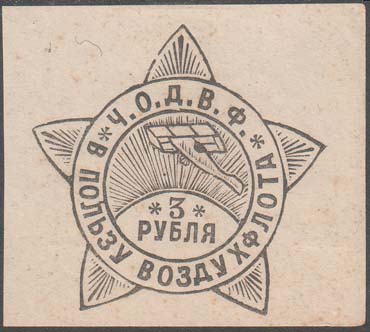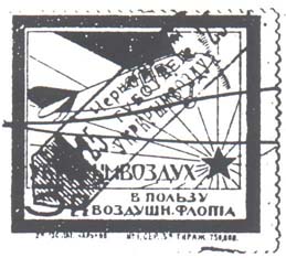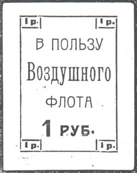 1923 г. Разм. рамки 38 х 46. Одноцветная печать на серо-голубой бумаге. Текст в три строки: «В пользу Воздушного Флота». По внутренним углам рамки и внизу номинал.