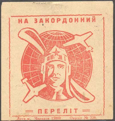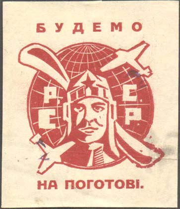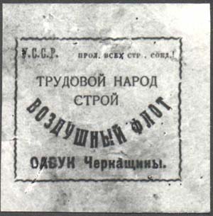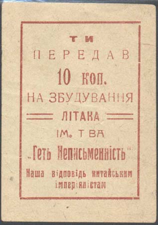 1930 г. Разм. 53 х 74 мм. Одноцветная печать на желтоватой бумаге. В прямоугольной рамке разм. 40 х 60 мм текст в девять строк на украинском языке: «Ты передал 10 коп. на постройку самолета им. о-ва «Долой неграмотность». Наш ответ китайским империалистам».