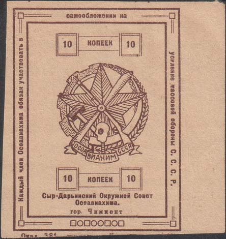 1930 г. Разм. 62 х 80 мм. Одноцветная печать на плотной бежевой бумаге. В двойной прямоугольной рамке разм. 55 х 75 мм в центре эмблема ОСОАВИАХИМ. Сверху и снизу в прямоугольных рамках номинал: «10 копеек 10». Между рамок по периметру текст: «Каждый член ОСОАВИАХИМа обязан участвовать в самообложении на усиление массовой обороны С.С.С.Р.». Внизу под рамкой выходные данные мелким шрифтом.