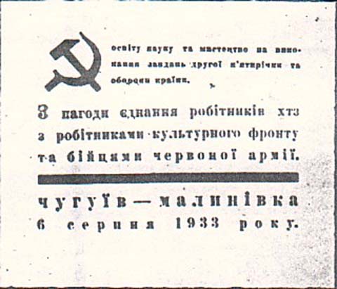 1933 г. Разм. 81 х 69 мм. Одноцветная печать на белой бумаге. В центре текст в три строки на украинском языке. Сверху слева серп и молот. Правее текст в три строки на украинском языке: «Просвещение наука и мастерство на выполнения задач второй пятилетки и обороны страны». Внизу толстая горизонтальная черта и текст в две строки на украинском языке: «Чугуев – Малиновка 6 сентября 1933 года».
