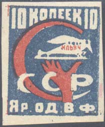 1924 г. Разм. рамки 30 х 30 мм. Одноцветная печать на белой (оттенки) бумаге. В прямоугольной рамке на сплошном фоне в центре рука, держащая самолет-моноплан «Ильич». Сверху номинал. Внизу текст в две строки: «СССР. Яр. О.Д.В.Ф.».