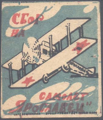 1924(?) г. Разм. рис. 53 х 60,5 мм. Трехцветная печать на плотной белой бумаге. В центре самолет-биплан, летящий влево на фоне облаков. В левом верхнем углу текст в две строки: «Сбор на». Внизу продолжение текста в две строки: «Самолет «Ярославец»». Внизу под рамкой мелким шрифтом выходные данные: «Лит. Лещенкова. Яросл. Гублит 524. Тираж 10.000.». На обороте красно-фиолетовый оттиск круглой печати диаметром 36 мм. В центре печати текст в две строки: «Ярославский Губ[ернский]. Отдел.». По окружности текст: «Всероссийский Союз Работников Коммунального Хозяйства».