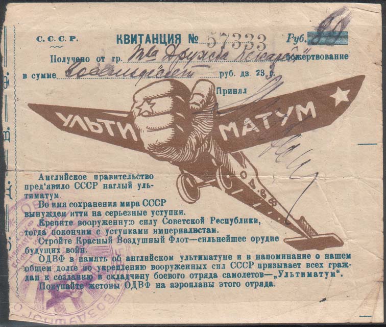 1923 г. Квитанция разм. 125 х 106 мм. Двухцветная печать на белой бумаге. В центре аллегорический рисунок: самолет с тексом «Ультиматум» на крыльях и аббревиатурой «О.Д.В.Ф» на фюзеляже. Носовая часть самолета в виде сжатого кулака. Сверху текст в четыре строки: «С.С.С.Р. Квитанция №... Руб. ... Получено от гр. ... пожертвование в сумме... руб. дз. 23 г. Принял ...». Внизу текст в тринадцать строк: «Английское правительство предъявило СССР наглый ультиматум. Во имя сохранения мира СССР вынужден идти на серьезные уступки. Крепите вооруженную силу Советской Республики, тогда покончим с уступками империалистам. Стройте Красный Воздушный Флот – сильное орудие будущих войн. ОДВФ в память об английском ультиматуме и в напоминание о нашем общем долге по укреплению вооруженных сил СССР призывает всех граждан к созданию в складчину боевого отряда самолетов – «Ультиматум». Покупайте жетоны ОДВФ на аэропланы этого отряда». Слева вертикально волнистая полоса, обозначающая линию отрыва. Левее вертикально аббревиатура «ОДВФ». На лицевой стороне фиолетовый оттиск круглой контрольной печати ОДВФ СССР.