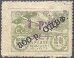 1924 г. Фиолетовая надпечатка в три строки текста: «О.Д.В.Ф.Т.Р. 1 руб. 1924 г.». на марке ОДВФ всесоюзного вспомогательного выпуска с надпечаткой нового номинала.