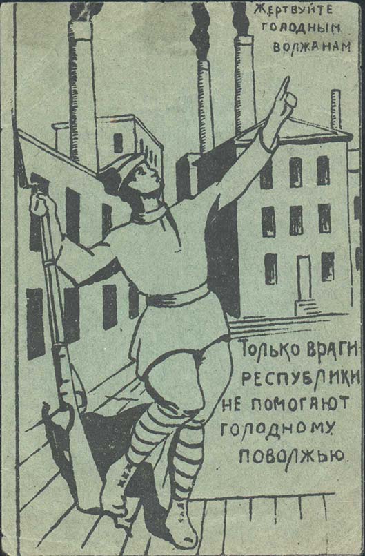 1921 г. 06.-08.11.1921 г. Листок разм. 89 х 131 мм. Одноцветная печать на зелено-серой бумаге. В прямоугольной рамке на фоне завода красноармеец с винтовкой указывает левой рукой на текст в три строки в правом верхнем углу: «Жертвуйте голодным волжанам». В правом нижнем углу текст в пять строк: «Только враги Республики не помогают голодному Поволжью».