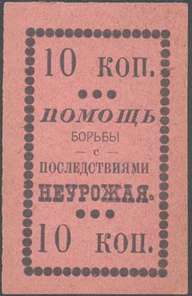 1924 г. Разм. 43 х 70 мм. Одноцветная печать на светло-красной бумаге. В рамке из кружков разм. 34 х 58 мм в центре текст в пять строк: «Помощь борьбы с последствиями неурожая». Сверху и снизу номинал.